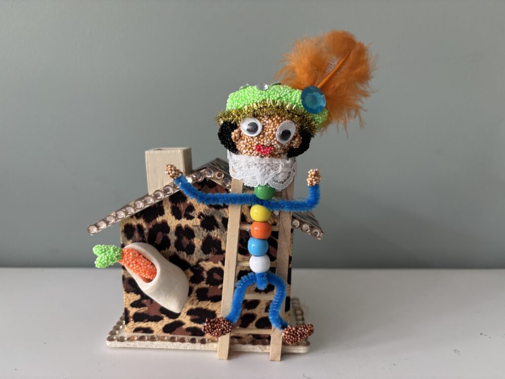 We starten de workshop met een korte uitleg over het speciale Decopatch papier, we geven de tips & tricks en de do’s & dont’s. Eerst versieren we het houten huisje met het Decopatch papier ofwel het toverpapier. Door verschillende laagjes papier over elkaar heen te plakken (pimp & patch) staat er een super tof effect. Als het huisje helemaal versierd is met het papier gaan we het huisje pimpen met bling bling. Vervolgens gaan we beginnen met het Pietje. Hiervoor gebruiken we Chenilledraad, kralen, Foam klei, wiebelogen en een veertje voor het Pietenmutsje. We laten het Pietje op een ladder klimmen en als finishing touch maken we het huisje af met een klompje en een wortel.